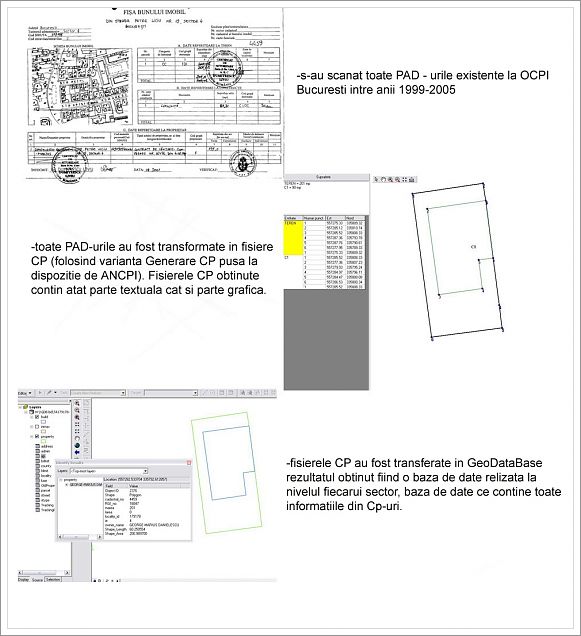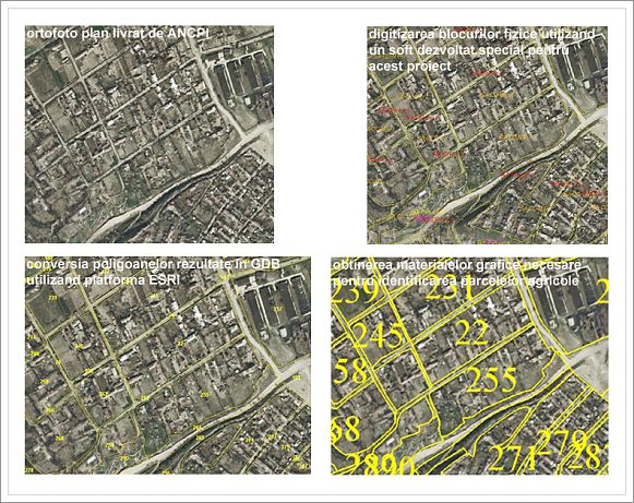 In acest scop a fost dezvoltat un soft propriu in care s-a facut digitizarea blocurilor fizice, dupa care s-a facut conversia pe platforma ESRI. Rezultatu final al acestui proiect a constat in obtinerea tuturor materialelor grafice aferente, necesare pentru identificarea tuturor parcelelor agricole.